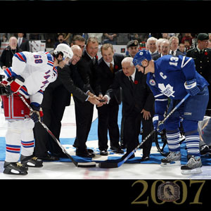 The Induction Class of 2007 proudly drops the puck as New York Rangers Captain Jaromir Jagr (left) and Toronto Maple Leaf Captain Mats Sundin (right) face-off. (Dave Sandford/HHOF/10Nov07)